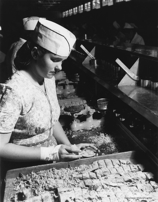 An employee packs tuna at Sun Harbor Packing Company in 1948. (Courtesy SDHC photograph collection)