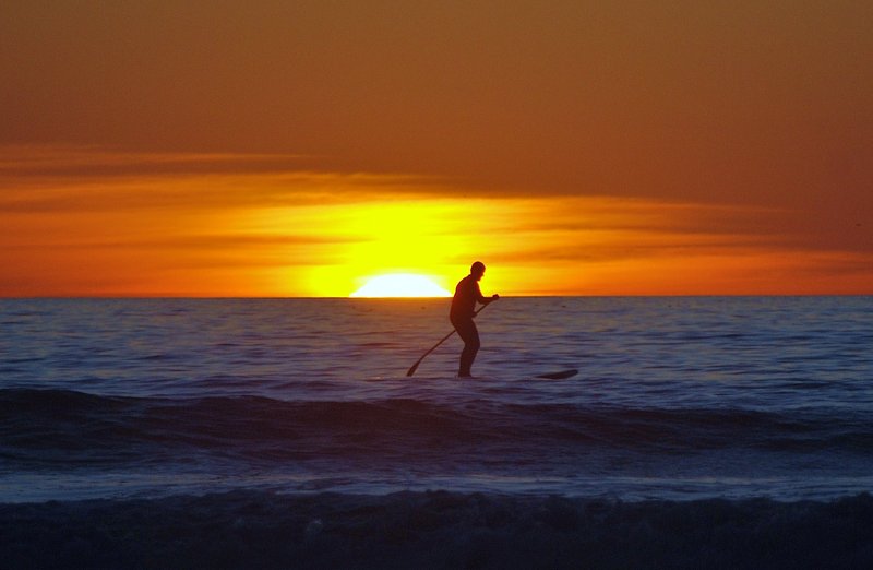 A lone paddleboarder takes advantage of some calm water as he spends some time reflecting amid the setting sun in Ocean Beach.