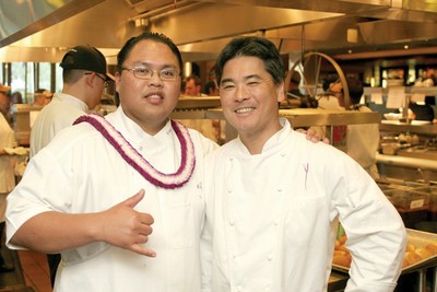 Master chef Roy Yamaguchi (right) joins Evan Cruz, executive chef of the La Jolla Roy’s, 8670 Genesee Ave., in the kitchen during the March 21 commemoration of the restaurant’s sixth anniversary.