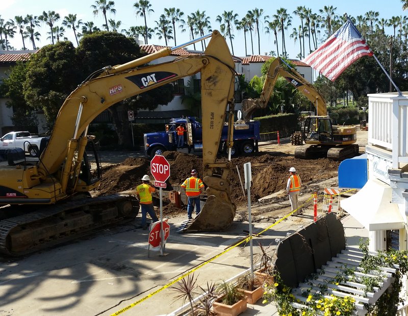 The owner of Piatti restaurant remarked that workers with La Jolla’s Avenida de la Playa Infrastructure Replacement and Sewer & Water Group were due off his block the first of February. Maybe he meant the first of February 2016, as the construction presence is as heavy as ever. Business on Avenida has plummeted since Labor Day amid reroutes and heavy equipment operation, which is expected to continue through May. PHOTO BY TERRY KRASZEWSKI