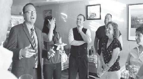Business owner Jake Sutton led a discussion group of about 20 small business owners in Banker’s Hill at Sanfilippo’s Restaurant on Fifth Avenue, June 21. A varied group of entrepreneurs, from graphic designers to artists and barbers, is forming a micro business district in Banker’s Hill with the aid of Warren Simon of the BID Foundation and BID Council. (Photograhpy by Dave Schwab)