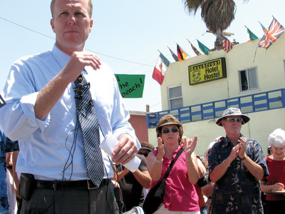 Standing at the foot of Reed Street in Pacific Beach, Councilman Kevin Faulconer announced Tuesday that he would work to bring legislation before City Council to ban alcohol on the beach following the violence that broke out Labor Day in Pacific Beach.