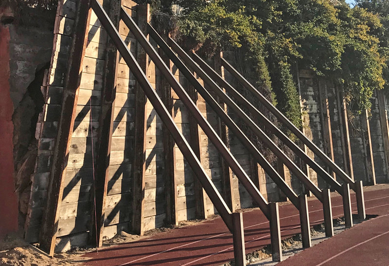 School district personnel have erected a temporary chain link fence away from the wall to keep students and others out of harm’s way but causing another problem. They also dug holes in the brand new track to put in support beams to hold the wall in place.