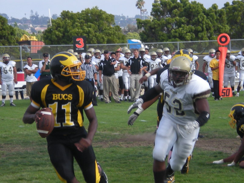 It was a big day any way you slice it. It was Homecoming on Oct. 14 — and the team’s biggest fan presence of the season could be felt. It was a chance for the Mission Bay High School (MBHS) football team to show how far it’s come since a disastrous 2010 season. But perhaps most of all, it was a demonstration of support for a seriously injured former teammate. Just before the game, MBHS head coach Willie Matson informed his team that a senior on last year’s squad had suffered a major neck injury from a diving accident over the weekend. Buccaneers’ quarterback Nate Long was asked if his team would be playing for his friend. “Yes,” he replied simply. After opening the game with little emotion and falling behind 14-0 at halftime, the Bucs dug deep within to pull out a huge 17-14 win over Serra High. MBHS played a nearly-flawless second half to secure the victory. “We went in at halftime and told [the players] they were losing respect from the other team,” Matson said. “We tried to reach them that way and they took it to heart. The best thing for a coach is when you find out your team does have heart. They came out and said, ‘We’re not going to take it. We’re going to fight to the end.’” The comeback started when the Bucs drove down to the Serra 10-yard line to start the third quarter. Facing a daunting third-and-goal situation, Long dropped back to pass and lofted the ball to the far right corner of the end zone. Wide receiver Jaquan Madyun reached out with his body fully extended and caught the ball as his feet simultaneously dragged the turf just inside the end line. The touchdown cut Serra’s lead in half. “He pressed on me, so I got him off and used my hands and made a good play on the ball,” Madyun said. “The quarterback put it in a good spot where only I could get it and the defensive back couldn’t do anything about it. I looked down at the line to see my feet and I kept them in.” On the ensuing kickoff, Matson opted for some trickery by attempting and succeeding in recovering an onside kick. The Bucs used the momentum swing to their advantage. Two plays later, senior MBHS running back Chris Byrd took a handoff from Long and showcased his explosive speed and elusiveness as he zigzagged back and forth across the field before finally sneaking into the end zone just inside the pylon for a stunning 49-yard touchdown scamper. The score was tied 14-14 with 3:40 left in the third quarter. “I felt like I had enough energy to run side to side 20 more times, but it was the line [that opened the holes] and I followed their blocks,” Byrd said. “They kept blocking all the way down and (senior offensive lineman) Lorenzo Pittman got my last block and I just dove into the end zone.” The Conquistadors tried desperately to recover some momentum on their next drive, but Bucs’ linebacker Donshay Bandy continued the rally by picking off a pass by Serra quarterback and returning it 24 yards to Serra’s 20-yard line. “It was crazy,” Bandy said. “I dropped back to my zone and put my hand up. Thank God I’ve got long arms.. I slapped it up, looked around and saw it redirect. I put my hands on it and took off.” After a stalled drive, MBHS kicker Bryan Grnada split the uprights with a clutch 31-yard field goal, giving the home team a 17-14 lead with 48 seconds left in the third quarter. From there, the Bucs ran the clock on offense and used a suffocating defense, which included back-to-back sacks by Isaac Griffin and Aaron Cobbler to finish off the victory. The win propelled MBHS to 3-2-1 on the season, raising its record above .500 for the first time since 2009. “It’s just like a wildfire,” Matson said. “When it starts up, it isn’t much. But once it catches and the wind gusts up a little bit, it takes off. I’m hoping that’s what happens. We’ll see.” BUC NOTES • The MBHS football squad dropped a tough road game to Madison High, 43-7 on Oct 21. • The Bucs travel to Point Loma High on Friday, Oct. 28 for an important league matchup beginning at 3 p.m. Mission Bay rounds out its home schedule with a contest against Hoover High on Nov. 4 at 3 p.m. The Buccaneers then travel to La Jolla for their final game of the regular season on Nov. 10, with kickoff set for 6:30 p.m.