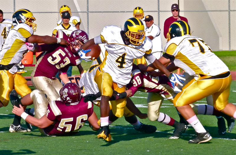 On a rain-soaked afternoon, the Mission Bay High School (MBHS) football team blanked division rival Hoover High 16-0 on Nov. 4. The win allowed the Buccaneers (4-4-1, 2-2) to close out their final regular-season home game with a needed victory at Dennis A. Pugh Field. “The defense was outstanding,” said Bucs head coach Willie Matson. “Hoover can really pile up some points on you quickly but our defense came out on a mission. The kids tackled and covered really well. I’m proud of them.” A steady downpour, along with sudden strong wind gusts, provided sloppy field conditions, which led to many mishandled plays. In the end though, MBHS’ determined ground game and pass rushing was too much for the Cardinals, whose spread offense proved difficult to maneuver in the mud. Mission Bay senior quarterback Nate Long, whose athleticism has been on display all season, suffered a hobbling ankle injury in the first quarter. Although Long was relegated to hopping around on one leg in-between plays, he missed only one series because of the injury. “I couldn’t let that happen in my last home game of my high school career, so I decided to suck it up and play and we pulled out the win, so I’m happy,” Long said. In tough field conditions, the first score is always crucial and it was MBHS that got on the board first. Its swarming defense, led by linebacker Donshay Bandy, gang-tackled Hoover quarterback Dionte Whitfield in his own end zone for a safety and a 2-0 lead in the first quarter. Bucs senior running back Chris Byrd followed up the safety by returning the ensuing free kick 72 yards for a huge touchdown and 9-0 Mission Bay lead. Byrd has made a name for himself this year with several long, electrifying scoring runs. Although Long was almost exclusively asked to play it safe and hand the ball off, he still made his mark. With 6:13 left in the first half, Long connected with senior wide receiver JaQuan Madyun on a perfectly executed fade route on fourth down. The 18-yard scoring strike gave MBHS a commanding 16-0 lead. “They were playing up [toward the line], so coach called a fade,” Madyun said. “I gave him (the defender) a fake inside and Nate put it in a good spot to let me go get it.” Madyun played a big role on special teams, punishing Hoover’s kick returners. “I like hitting and being on defense,” he said. The second half belonged to the Bucs defense. It dominated the line of scrimmage and caused havoc in the opponents’ backfield again and again. Junior linebacker Dylan Lieto had a big sack for MBHS to go along with 11 tackles. “We know where the potholes are. We knew it was going to be raining and it was going to be bad but we just came out and played football,” Lieto said. The Bucs will end the regular season with a game at La Jolla High on Nov. 10. News and notes • MBHS senior linebacker Isaac Griffin had a team-high 12 tackles and one sack. • Sophomore tailback Devante Kinder provided tough running in the trenches while gaining 105 yards on 21 carries. • Visit us online at www.sdnews.com to see what team Mission Bay will draw in the CIF playoffs. The Bucs could potentially play a home game in the first round of CIF. Bucs scoreless in deja vu with Point Loma