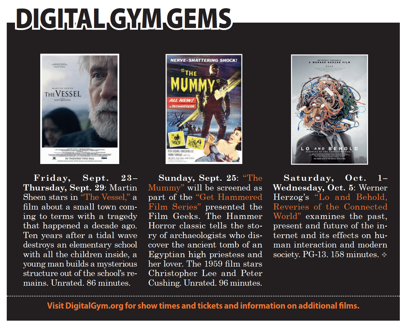 Cinema Under the Stars: Films presented at an outdoor viewing space on various nights of the week. Upcoming films: