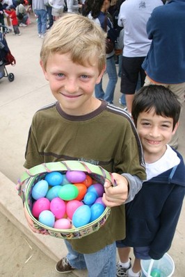 Aidan Scott (left), 9, and Jack Gallegos, 8, show the eggs they collected April 7 at the Spring Egg Hunt at Standley Park, 3585 Governor Drive.
