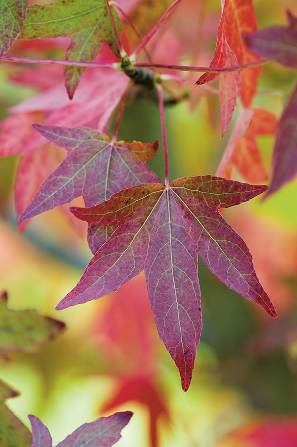 Sweet Gum (Liquidambar) – Many people confuse this for a maple since the leaf shape is so similar. But liquidambars are more vertical in shape and they also have a distinct and rather large, spiny seed pod that falls almost year-round. For that reason, it is best not to plant them near sidewalks, patios or courtyards. In very late fall, the colors are stunning—from red tones to orange and peach. The foliage of Palo Alto turns bright red to orange-red. Burgundy provides deep, reddish-purple leaves. Festival will give you a range of autumnal hues including peach, rose, orange, yellow and red.