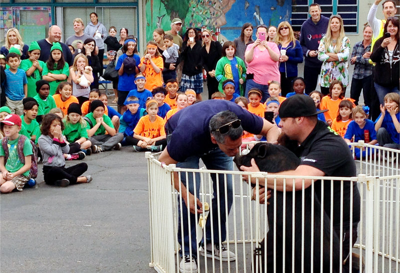 Ocean Beach Elementary principal Marco Drapeau hogged the spotlight before school on Friday, March 18 when he kissed a pig in front of students and staff. On Jan. 31, the school held a jogathon where the students were told that if they raised more than $14,500 (last year’s amount), Drapeau would kiss a pig. The students were inspired and raised more than $16,500. The money will help fund the arts program.