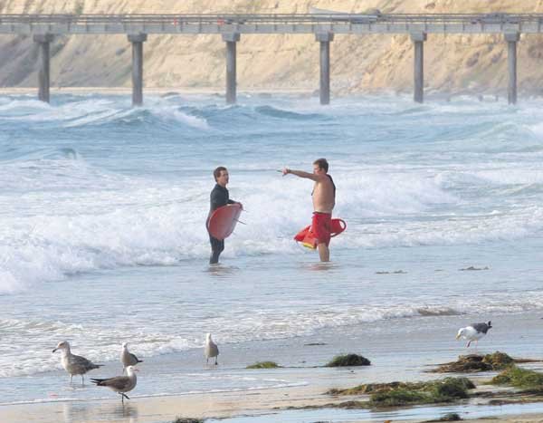 • La Jolla Shores beaches — from the Marine Room to Scripps Pier — were closed after lifeguards spotted a 12- to 15-foot great white shark about 50 yards off La Jolla Shores around 3 p.m. on July 2. Nearby beaches — including Black’s Beach, La Jolla Cove and the beach at Scripps Institution of Oceanography — were put under an advisory warning immediately after the sighting. Following the sighting, lifeguards scoured the waters by boat and helicopter for several hours, but did not locate the shark. At press time, there were no further sightings of the shark, and all of La Jolla Shores’ beaches were reopened, just in time for the Fourth of July holiday. Lifeguards urge continued caution to beachgoers in the area. • Lifeguards, paramedics and a Good Samaritan successfully resuscitated a 62-year-old man who had a heart attack at the northern end of Black’s Beach on June 26. Lifeguard Sgt. Eric Care was nearby and responded to the call from dispatch, along with several other lifeguards. “The crossing over the cobble-stones was technical but the clearance of the [Toyota] Tundra made it possible. The former Expedition U-31 most likely would have become stuck,” said Care of the lifeguards’ new vehicles, donated to the city by Toyota. Once lifeguards arrived on the scene, a citizen was already giving competent CPR, said Care. Lifeguards then used an automated external defibrillator immediately and chest compressions were administered intermittently for 10 minutes. After the third shock, the man was revived and was transferred to a nearby hospital. “The call couldn’t have gone much better, in my opinion,” said Care. “Effective CPR took place immediately and advanced care was en route while the patient was revived. As soon as the transport was needed, we had three medics at the patient and a helicopter landing.” • Marine Street and Windansea lifeguards rescued a family of four caught in the Sea Lane rip current on July 1. Two lifeguards witnessing the incident from the beach used rescue buoys to get all four swimmers out of the water and safely on shore. None of the family members were hurt. Lt. Andy Lerum had some advice for swimmers in the sometimes-unpredictable ocean. “First of all, always swim with a buddy,” he said. “If you get stuck in a rip current, the best thing to do is not to panic, and swim parallel to shore until you are out of the rip current and catch the whitewater waves to shore.” • A parasailer who was relatively new to the area lost his lift and made an emergency crash landing on the side of a cliff. Although he was uninjured and landed in a relatively stable area, he was stuck in an area where he could not go any further toward land. Lifeguards were able to rescue the parasailer from the cliff side, and he was not hurt.
