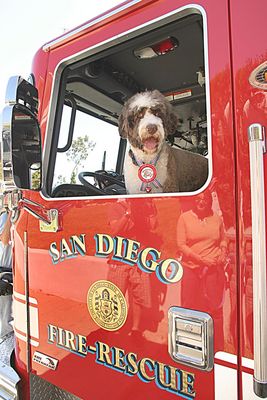 For many in the La Playa neighborhood of Point Loma, it was a moment to paws and reflect. Cabrillo, a Portuguese water dog, was showered April 21 with praise and adoration for his role in saving property and, quite possibly, human life. Cabrillo became the first canine to be recognized by the San Diego Fire-Rescue Department for his relentless effort to alert his sleeping owner, Sandra Angel, to a raging house fire just doors away. Around 3 a.m. on April 2, the persistent pooch began scratching at Angel’s mattress, tugging at her sleeve and going from window to window of the Rosecrans Street home to rouse his sleeping master. “That’s when I smelled smoke,” said Angel. “I got out of bed and saw a smoky haze and the orange glow of a fire from the house a few doors away.” Set in motion by Cabrillo’s alarms, Angel called 911 while her boyfriend, Charles Williams, began waking neighbors and urging them from their homes. Concerned for the safety of several elderly neighbors, Angel also began phoning other residents to alert them to the fiery danger. “It’s scary when it happens in the middle of the night,” Angel said, “but you get focused pretty fast when you realize you might have just minutes to save a few precious belongings and get to safety.” Officials credit Cabrillo’s alertness and unrelenting effort to wake Angel and Williams for triggering a rapid response by fire crews and other emergency response personnel. Three engines, including one from Station 22 in Point Loma, arrived at the burning home minutes later to contain the flames before they could spread further within the home or to neighboring residences, said Maurice Luque, spokesman for the San Diego Fire-Rescue Department. The fire, which was sparked in an attic because of cracks in the home’s fireplace mortar, caused an estimated $250,000 damage to the structure and contents, said Luque. No injuries were reported. The damage and potential for loss of life was minimized because of Cabrillo’s alertness, said Luque. As a result, fire-rescue officials recognized Cabrillo for his “dogged determination” Tuesday with the first “Honorary Fire Dog” award — complete with a lifesaving commendation and a box of doggie treats. “It’s pretty cool that a dog played this kind of a role in preventing what could have been a much more tragic outcome,” said Luque. “This is a rather unique situation and we wanted to recognize both Cabrillo and the owners for their efforts,” he said. “This is the first time in the six years I have been doing this that someone has told me about a dog being so instrumental in helping to save property and prevent, heaven forbid, human tragedy.” Angel said Portuguese water dogs have a lengthy distinction as a working-class breed. “These dogs are bred to do a job,” Angel said. “That evening, Cabrillo’s job was to wake me and wake Charles and alert us to the danger just outside our window.” Angel, a Realtor with Coldwell Banker in Point Loma, said Cabrillo will turn 2 on June 14. She has had the chocolate-and-cream-colored pooch since he was just 8 1/2 weeks old. Since the night of the fire, people stop her on the street and ask to have their picture taken with Cabrillo, she said, and ask to pet him. Angel said she is considering taking Cabrillo on a possible public relations tour of local schools as an ambassador of heroism.