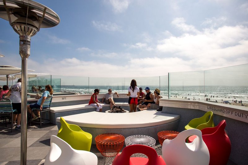 The other side of the menu features sushi and rolls — though many of them are not your typical sushi offerings. Chef Brad Wise, formerly of Pacific Beach’s JRDN, said his Latino sushi chef often infuses his creations with a decidedly Hispanic flair — and it works. The Enfuego roll (crab, avocado, torch-seared salmon and roasted garlic aioli) is a favorite, and the lobster roll (lobster, avocado, eel sauce and aioli, with a light and crispy tempura wrap) blends flavors one wouldn’t expect to find in a sushi restaurant. Wise said the menu will change occasionally with the seasons, though the most popular favorites will remain. His inspiration comes from an eclectic mix of flavors that combine to create a truly unique menu. The eatery’s cocktail menu offers inspired creations, as well. The Bellyflop, with Grey Goose vodka, watermelon purée, lemon juice, simple syrup and cucumber is a particularly tasty treat on a hot day. The menu also offers top-notch beers and wines to pair with the savory fare. The restaurant is designed to resemble an empty swimming pool, with pool tiles, lounge chairs, fire pits and depth indicators (4 ft., 5 ft.). Servers seem ready to come to your rescue in pool lifeguard-type wear. Though the entire restaurant is located out in the open, there exists some overhead cover for inclement weather and heat lamps for cool evenings. The people watching, meanwhile, is unparalleled, with views onto both the boardwalk and the beach.