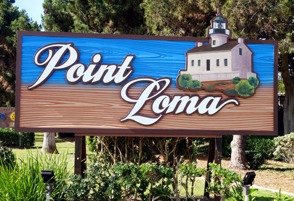 Point Loma has a new sign gracing the entryway into the community from San Diego International Airport. “Weathered by years of irrigation overreach and ever-prevalent termites, the Point Loma sign on North Harbor Drive was declared to to be in critical condition last year by then-Rotary president Leon Scales,” said Cecilia Carrick of the Point Loma Association. “Quarts of BONDO and several layers of paint applied by our skilled Rotarian friends were barely holding the sign together until design and funds were arranged by the (association) for a new purchase. “That’s when a very generous Point Loma private donor and the County of San Diego stepped in to help out. The work, commissioned to Integrated Sign Associates, produced a vibrantly colorful replacement that is now in place.” Nonprofit Point Loma Rotary Club provides support for community projects in Point Loma, the greater San Diego area and the world. Created in 1961, the Point Loma Association comprises residents and businesses committed to improving the quality of life in Point Loma through beautification, education, charitable activities and civic collaboration. Carrick noted the North Harbor Drive gateway sign was originally installed by the association in 1980 and has served as a geographical landmark for millions of visitors and neighbors for more than 35 years. Association president Robert Tripp Jackson noted Dorothea (Dottie) Laub and her late husband Richard paid for the original gateway sign’s installation and for landscaping around it. “It was all wood,” said Jackson of the original sign. “It had started to deteriorate, and (the association) had it refurbished three or four years ago, but it was pretty much disintegrating. So (Carrick) found the people who’d made the OB sign. So they went ahead and produced a new one for us.” Jackson said two anonymous Point Loma donors and the county deserve kudos for stepping forward to assist with paying for the cost of the new sign, which he noted cost approximately $12,000.