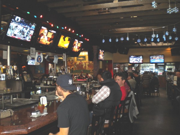 “I love it when wings are small like these because they’re a lot tastier,” said one of my tablemates as dozens of high-definition flat screens projected the Rose Bowl game at a compassionate volume. According to our foggy bone count, the wings came 16 to an order, and they washed down like potato chips with our Blue Moons.