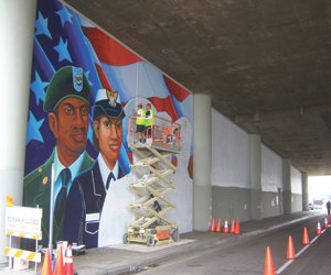 An enormous mural is being painted on the northwest wall under the Interstate 5 overpass at the border of Point Loma and Old Town.