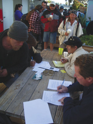 City and county officials have launched their first official “Point-In-Time Count (PITC) 2011” drive to determine an accurate number of “actual” homeless residents around San Diego — a campaign that is now reaching into the streets of Ocean Beach. To help educate the community about homelessness and to plan for additional services to meet the needs of the disadvantaged, the Ocean Beach Clergy Group — formed late last year to include a majority of local churches — helped trigger the survey after asking for a headcount from the city and county of OB’s homeless residents and transients. Because no formal survey had ever been done, those numbers have never been officially determined and recorded for Ocean Beach until recently, even though the U.S. Department of Housing and Urban Development requires communities to collect information about homelessness in their area to obtain funding for homeless services and agencies. Tim Sandiford, a member of the OB Clergy Group and a representative to the Regional Task Force on the Homeless, joined a group of five volunteers from various organizations between Jan. 28 and Feb. 8 to complete survey forms containing 10 pages of detailed personal information from each homeless participant. Some of the forms took 20 minutes each to complete. Questions ranged from personal information, source of income and status to past incarcerations, healthcare and services used or needed. The surveys concluded with an optional narrative by the individual person being surveyed. Each participating homeless person received a $10 gift card for Subway sandwiches or Jack in the Box after completing the form. Surveys have been conducted on Saturday mornings at the First Baptist Church of Ocean Beach at Santa Monica Avenue and Sunset Cliffs Boulevard. The same location is converted into a busy Saturday breakfast “soup kitchen” solely organized and distributed by Second Chances Bread of Life, various OB churches and an army of volunteers. Estimates are that between 60 and 80 surveys have been completed for Ocean Beach, although surveyors had expected closer to 100 initially. The official survey results are expected to be released later. In conjunction with the homeless headcount, accompanying dogs were also identified for the first time. In addition to dog food donated by Supermaxx on Newport Avenue, all of the canines received a weight-appropriate dose of a topical flea- and tick-prevention medication supplied by the owners of Dog Beach Dog Wash on Voltaire Street. Dog food and the preventative flea treatments will continue to be made available on Saturdays to all dogs. The canine-based services appeared to be positively received by members of the homeless community. For more information about the surveys and local homelessness outreach, contact the Regional Task Force on the Homeless at (858) 292-7627. Young students bring breath of fresh air to survey An unexpected twist to the Feb. 5 homeless breakfast/headcount occurred when 11 third- and fourth-graders from Torrey Hills Elementary School in the Del Mar School District brought a breath of fresh air to Ocean Beach. Calling themselves “The Imagination Club,” the students were accompanied by their reading teacher Caroline Nuttall and five parents. The girls performed well-rehearsed songs for the survey participants and volunteers, and the young students later offered their help where needed. “The Imagination Club” meets once a week and gives up its lunchtime to do community service and to collect experience in social leadership and public speaking. The girls said this was their first close contact with the people of the homeless community and most of them were taken by surprise at the large numbers of disadvantaged residents in Ocean Beach. Despite initial shyness, the girls’ smiles abounded amid valuable impressions and a promise to return to Ocean Beach in the very near future. — Bianca Koch