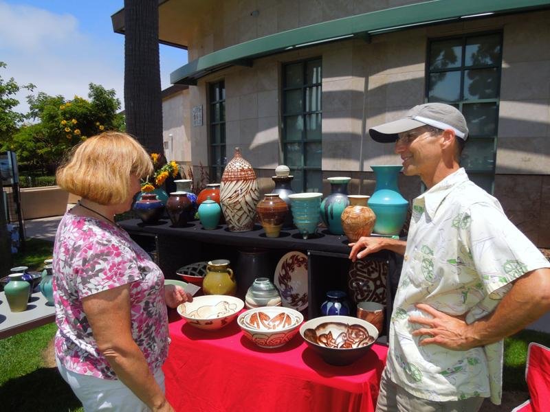 Point Loma artists filled the space and time of summer with life’s more leisurely luxuries on July 21 by hosting an art and ice cream event at the Hervey/Point Loma Branch Library. Members of the Point Loma Artists Association exhibited watercolors, acrylics, prints, ceramics, cards and jewelry, donating 20 percent of their proceeds to the library. Visitors enjoyed free ice cream while they browsed, chatted with artists and found that perfect piece of art. “Art is something you can enjoy and that will enrich your life,” said Beverly Brady, who uses acrylic for her realism on canvas. Watercolor artist Julie Anderson said many people do appreciate and own original art. “But most are looking for affordable art,” she said. Anderson and Dixon E. Johnson, a potter, blossomed into their talents later in life. Both take inspiration from their life experiences and apply it to their creative process. “I paint what I know and love,” said Anderson, who picked up a brush nine years ago. Her specialty is painting from pictures. Her original works, prints and cards capture the drifting moments of her canoe trips and unbridled innocence of her toddler grandchildren. Her sailing scenes are commissioned and used as trophies for regattas. Johnson, a dialysis nurse at the Veterans Affairs Medical Center, started working in earnest with clay six years ago. “I thought I’d go crazy if I didn’t do something creative,” he said. “The clay is centering. When I’m in the moment I’m not thinking about the mortgage, problems at work, or conflict at home. It’s a sacred place to meditate and not think — just be. Working with clay is my meditation.” Johnson’s ceramics, a varied collection of bowls and vases, are notable for their varied circular patterns from suns to Celtic knots. His display didn’t showcase the urns he makes for cremated ashes. Those are turned on request and require hands-on involvement from those who want them. It’s a technique he learned from an instructor. “When my mother died, family and friends sat around and passed clay for her urn and shared memories about her,” he said. “After the session, the clay was turned into an urn. It is infused with loving thoughts and feelings. Our DNA became part of the vessel, so she is surrounded by the ones she loves.” Georgia Hoopes is a lifelong artist who combines Eastern and Western techniques in her watercolors. For Hoopes, whose son died unexpectedly in 2004, art isn’t what she does for a living or hobby, but what she does for life itself. Hoopes said that while she pours emotion into her work, she never tells people what her works mean to her. Because art is interpretative and different for each person, she only shares her process for arriving at a finished piece. On exhibit was one of her favorite watercolors, “Prayers of Our Mothers.” It was inspired by the “Flags of Our Fathers,” a book-turned-movie about the Marines and Navy corpsman who raised the flag on Iwo Jima during World War II. The ethereal red-and-blue-hued painting is of a woman wearing a statue of liberty crown in front of an American flag. At the bottom of the painting is an excerpt from a poem by Rumi, the 13th century Persian poet. Hoopes prices her art not by the time it takes to complete, but by its size. She is selling “Prayers of Our Mothers” for $600. “Everybody’s asking about it today,” she said. “But no one is buying.” But that’s OK for now, Hoopes said. “If somebody wanted to buy it, I’d have to figure out how to let it go.”