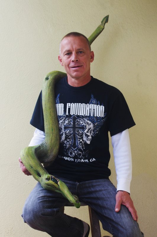 Woodcarver Todd Bartlett admits his head has always been in the clouds. And that’s what makes the Pacific Beach artist’s work so creative. “When I was a kid, I used to look at the clouds to see what I could find,” said the surfer and owner of Liquid Foundation Surf Shop on Mission Boulevard. “I still do.” Only now, in addition to finding forms in the sky, he finds them in pieces of driftwood and other raw wood he collects at area beaches and parks — and anywhere else people are cutting down trees. He started carving the trunks and tangled limbs about two years ago. His living room, backyard and driveway are full of the unusual shapes. While some pieces weigh only a few ounces, others are too heavy for one person to pick up. Bartlett said he creates everything by hand, using only two rusty handsaws, hammers, chisels and an assortment of files. “My girlfriend says someone is going to see my files and think I’m in prison,” he said, laughing. She recently bought him a chainsaw, but Bartlett hasn’t used it yet. For now, he’s sticking to his old tools, carving thousands of scales one by one on his fish and dragon sculptures. While some people see only firewood from felled trees and wood that has floated in on the tides, the father of two sees a whole menagerie. His technique is to carve off the excess wood, revealing shapes that were once seen only by him. “The piece of wood determines what I’m going to make,” he said, stripping bark from one piece and staring at it until it coughs up an animal, fish or man to him. “If I don’t see something in the wood, I won’t even take the bark off. I put the piece in the backyard ’til I see something … But right away, as I’m a surfer, I see barreling waves (in many pieces).” “I think the pieces that are the neatest are the ones that already look like something, like this snake,” he said. He picks up one of his snake carvings and drapes it over his right shoulder. Bartlett carves all of his creations from single pieces of wood. He said he “cuts away, but never adds to it.” Most carvers, he said, “cut off all the limbs and leave a Tiki.” He does just the opposite, watching the limbs transform into something unique. His wooden zoo includes an iguana. “Its tongue was already sticking out when I found it,” Bartlett said. There’s also a rattlesnake curled around a trunk and a crocodile with a fish in its mouth made of wood from Kate Sessions Park. Bartlett said he’s found that the best time to scour the beaches is after storms and big swells. He’s on the lookout now for flotsam and jetsam rumored to be making landfall soon from Japan’s 2011 earthquake. Bartlett said he is drawn to interesting shapes. “This piece was from Swami’s beach,” he said, pointing out his hunter man and fish piece. “I think the wood is white oak. … It weighs about 70 pounds.” There’s a coyote eating a rat that was collected from the shore at Imperial Beach; the rattlesnake from Kate Sessions Park, “where guys with orange jackets were cutting a tree down;” three octopuses entwined around a fish from Black’s Beach, and the beginning of a giant coral reef from a neighbor’s felled tree. “I’m one of those kids that starts 10 things and finishes two,” Bartlett said. He uses polished stones for the eyes, saying, “They’re creepy at night.” He colors his creations with wood stain and even crayons. Bartlett only started carving two years ago after he and his kids picked up an interesting piece of wood at the beach. “Like surfing, you get to express yourself [with woodcarving],” he said. “It’s so much fun taking the bark off.” He points to his front lawn, where bark and scraps of wood have replaced the grass. Bartlett often carves in front of his surf shop. Recently, he tried to work at the beach north of Crystal Pier in Pacific Beach. But he ended up with a crowd of about 20 people who wanted to chat about his work. “I think I got four rubs in before everyone started asking questions,” Bartlett said. “One man offered me $1,500 for a piece.” “I’ll never ever be able to make the same thing again” because each piece of raw wood is different, he said. Everything is one of a kind. Though he hasn’t tried to sell anything yet — he wanted to build a collection first — his dream is to find a local gallery to display his work and sell it for big bucks, eventually making it possible for him to carve full time. “This is more relaxing than running my shop,” he said. For now, Bartlett said, “The pieces are made by hand in the United States by a surfer boy. And that’s pretty cool.” • Liquid Foundation Surf Shop 3731 Mission Blvd., 858) 488-3260