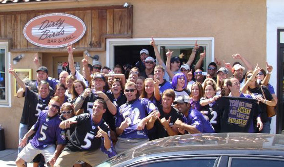 What started out as a small flock of Baltimore Ravens fans in Pacific Beach searching for a place to cheer on their team has turned into a mass migration of purple-and-gold-clad locals to Dirty Birds every football Sunday. “A lot of Baltimore fans lived in the immediate neighborhood and were looking for a place to watch the game,” said Dirty Birds owner Leigh Gibson. “It started off with a couple of guys coming in and asking if we could turn the sound on for the Ravens game when it was on and it slowly grew from there.” Though a born-and-raised New York Jets fan from Long Island, Gibson gladly turns his restaurant-bar over to these dedicated fans. “It’s a good group of people who are passionate about their team,” he said. “We’re just happy to give them a place to come and be surrounded by other Ravens fans for the two or three hours during the game.” Those who have built up a ravenous appetite can be assured they are among some of the finest, most carefully prepared, creatively flavored chicken wings in the country at Dirty Birds. “The wings are hands-down our bread and butter here,” said Gibson. “We have national acclaim from Yahoo Sports for having some of the top wings in the country.” With more than 30 chicken-wing flavors to choose from — ranging from sweet to spicy, naked to saucy — Dirty Birds has something for everyone, including other solid menu items made from fresh ingredients. A great accompaniment is a good, old-fashioned brew to wash it all down. To complete the perfect football Sunday package, Dirty Birds offers specials on $15 buckets of bottled domestic beer, $10 bottles of champagne and $2 mimosas all weekend. “We also have 13 flat-screen TVs that encompass the bar,” he said. “From every seat, you have access to at least three to four TVs in your immediate peripheral vision.” Dirty Birds televises the Ravens and San Diego Chargers, which Dirty Birds also supports. Other games are screened simultaneously via the NFL Sunday Ticket package for those who want to keep an eye on their Fantasy Football teams. Dirty Birds is located at 4656 Mission Blvd. For more information, visit www.dirtybirdspb.com or call (858) 274-2473.