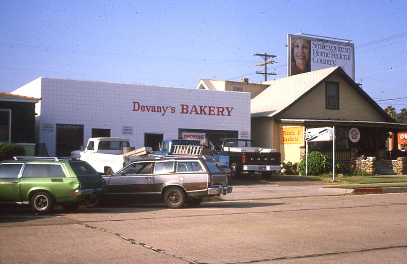 DEVANY’S BAKERY began on Ingraham Street, where Marino’s Pizza is today, in 1946. It moved to Pacific Plaza at the east end of Vons in the 1960s, and ended up at 966 Felspar St., where it went out of business around 2000. I took this picture in September 1979. Isabel Cruz did some substantial remodeling when she opened her Cantina restaurant on the site in 2002. Yup, the antiques store next door is now Cafe 976.
