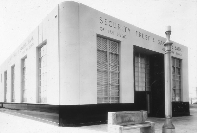 HOME BANK OF CALIFORNIA, at the southwest corner of Bayard Street and Garnet Avenue, can meet your financial needs today. But from 1946 to 1976, you would have done business in the sturdy edifice above. It opened as Security Trust & Savings and ended, I believe, as Security Pacific Bank. Check out the classic concrete bus bench. I had been led to believe that the light bulbs were removed from the street lamps on Garnet Avenue after Pearl Harbor for wartime black-out purposes, but I’m not sure why they wouldn’t have been replaced by the time Howard Rozelle took this 1946 photo.