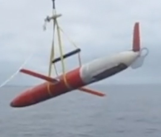 The spray glider’s purpose is to take temperature, salinity and ocean current measurements. The data is collected and fed back via satellite.