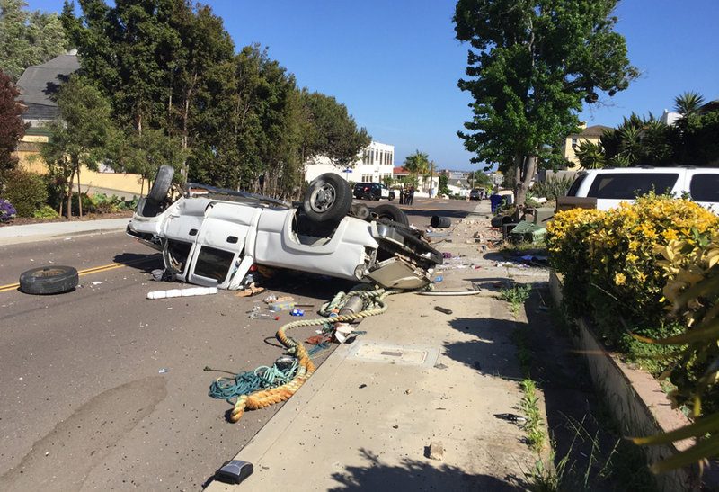 In the early afternoon of April 23, an alleged drunk driver in a white pick-up truck traveled at a high rate of speed up Cañon Street in Point Loma, fish-tailed near Willow Street, sideswiped a car coming down Cañon Street, left the road and flipped. The truck then hit a tree, two concrete walls, two other vehicles parked in their driveways and a utility box, then landed upside down in the middle of Cañon Street. No one was killed or seriously injured, according to witnesses, and the driver escaped the crash with a cut on his lip.