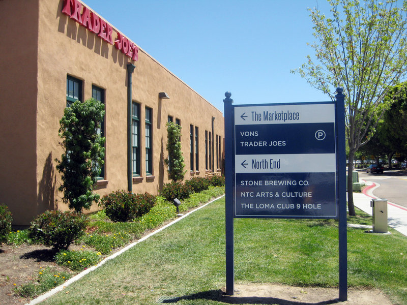 There were some hurdles to clear with getting permission for new signage at the center. The former military base is listed on the National Register of Historic Places, and many of the individual structures are designated as historic by the city of San Diego. Dozens of the historical buildings have been adapted for stores, offices, schools and other purposes. But in the interests of authenticity, many things about the base, such as colors, architecture and building materials, cannot be changed, as that would alter its character, which is being preserved.