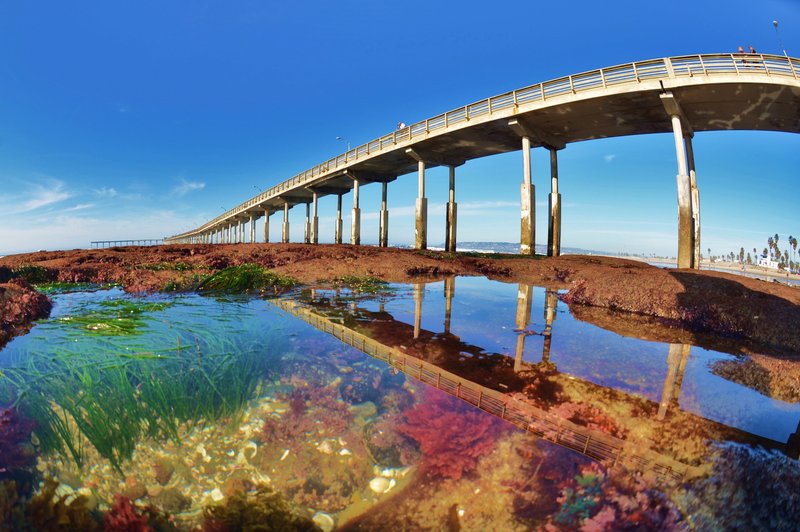 Once again, the Ocean Beach Pier casts an imposing daytime presence, this time at very, very low tide. The Jim Grant photo exposure reveals the shoreline loam that usually rests underwater as the pier is reflected from above. It all makes for quite a collage of shapes and colors. The pier turns 50 this July.