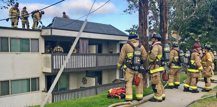 An Ocean Beach apartment complex was damaged by fire late afternoon on Aug. 12. Passersby observed smoke coming from the Nimitz Pointe Apartments at 2401 Seaside St. and notified San Diego Fire-Rescue. Responding fire units were dispatched at 6:07 p.m. As the first fire engine approached the site, firefighters reported to other units they could observe smoke and flames coming from the units. While those first firefighters prepared to fight the fire, other arriving Fire-Rescue units were directed to begin a precautionary evacuation of the apartments. The fire was discovered to be coming from the top (third) floor of the complex and located in the ceiling of one apartment. After using hoses to douse the flames, other firefighters gathered on the roof using an axe and chain saw to cut away portions of the roof and vent the fire looking for hot spots. Fire damage was confined and prevented from spreading. However water could be observed cascading from the balconies of apartments below the affected unit. While rolls of roofing materials could be seen on top of the complex, the origin of the fire was apparently electrical and not related to roofing work. Fire units were on scene for 90 minutes.