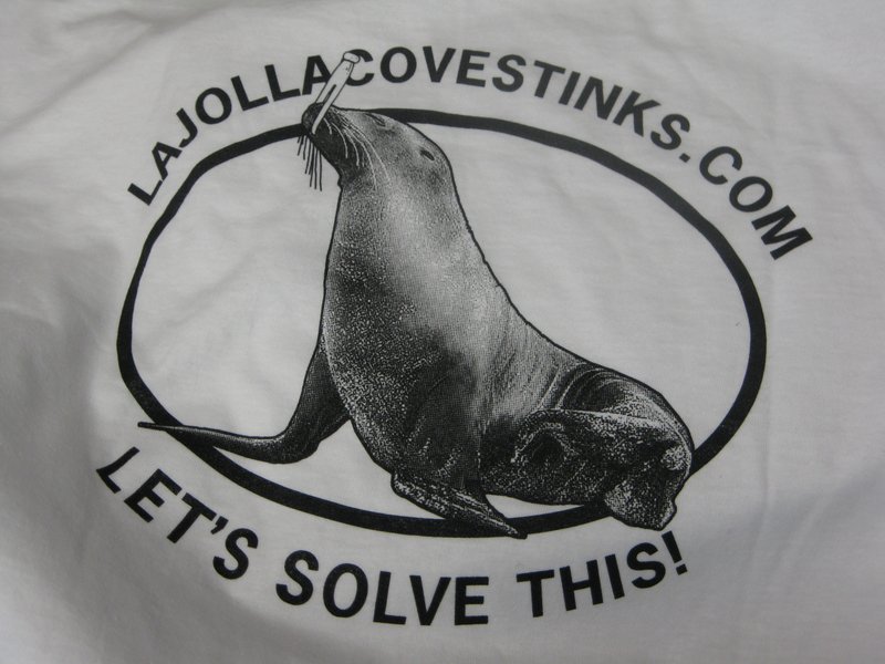 Marengo held up T-shirts that call attention to the problem showing humans — and sea lions — with clothespins holding their noses shut.