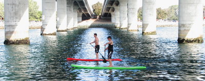 A pair of competitors paddle below the Ingraham Street Bridge on the calm waters of Mission Bay during the 15th annual Hanohano Ocean Challenge, which drew hundreds of participants Jan. 29.