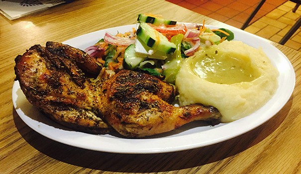The plate included Greek salad, pita bread and a generous scoop of real mashed potatoes. We loved the crispy herb-dusted skin on the bird and the teasing, citrus element of the gravy.