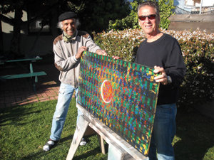 During the day, India-born Mohan Sundaresan works around La Jolla, restoring and refinishing the interior of many fine houses. But when he comes home, after a short break, he goes out to his studio, located at 523 Genter St., and takes the same industrial building materials, like aluminum sheets, particle board, plexiglass, wood and paper, and transforms them with his true passion — art — until the wee hours of the night. One of Mohan’s specialties is grinding and polishing aluminum sheets by hand or with a Dremel rotary drill, creating swirling three-dimensional patterns and illusions, which are further touched up with automobile paint, a technique he learned from a five-year apprenticeship with Andreas Nottebohn in Marin County. Mohan also likes to paint abstract florals and geometric patterns on particle board, wood and poster board (which he wets and wrinkles), with acrylics. Mohan forgoes brushes, preferring to paint with his hands and fingers. “I paint like a pig playing in a pool of mud,” he said. “In India, we eat with our fingers. We basically do everything with our hands. So why not paint? It gives me more of a tactile connection with my medium.” Mohan draws the inspiration for his art from several sources, including his dachshund “Dizzie,” who he walks daily at the Cove. “Dizzie is my philosopher,” said Mohan. “He believes he is part of everything and everything is a part of him. Dizzie inspires me to realize my oneness. My father’s words are also important to me. He taught me that at some point you have to teach yourself. You have to grow and evolve on your own.” Music is also important to Mohan He listens to a number of artists whiles he paints: Beethoven, Rossini, Miles Davis, Neil Diamond, Paul Anka and Willie Nelson, to name a few. He said he is inspired by painters William Turner and Zao Wo-Ki. Mohan calls his artwork “invitation to openness.” His goal is to help people see beyond the norm, to see things from new and different vantage points, to see the patterns in nature, and to see how everything is interwoven. Mohan said his art work began as a hobby, then became a habit and a passion, and is today an obsession. “I can’t go a day without painting,” he said. “It is such a release. I used to travel all over the world, but now I travel when I paint.” Mohan was born in 1945 in Bangalore, India, which he calls “yhe pensioners paradise” because so many of the British civil servants and military who wanted to remain in India bought homes and retired here. Mohan was raised in a large colonial estate surrounded by mango trees. His parents, though from the Hindu Brahmin class, converted to Christianity by way of the Danish Mission. Mohan’s father was an aeronautical engineer who earned his degree as a young man at Tri State College in Indiana. When Mohan was 20 years old, his father insisted that he go to England to work. After five years doing various jobs in London, his cousin invited him to Vienna, Austria, and taught him the fashion design business, in which he worked for 28 years. It was in the United States where Mohan met his American wife, Anna, and in the late 1990s they moved to La Jolla. Steve Medoff is Mohan’s’ best friend and also his agent. Medoff befriended Mohan during a restoration of Medoff’s building on Prospect Street. Medoff, who is a semi-retired corporate broker, an art collector and an avid big-game fisherman, became fascinated by Mohan’s artwork and decided he wanted to help promote him. “I think Mohan is a fantastic artist and is La Jolla’s best-kept secret. I want to help people get to know him and his work. He is an important cultural treasure for our area.”