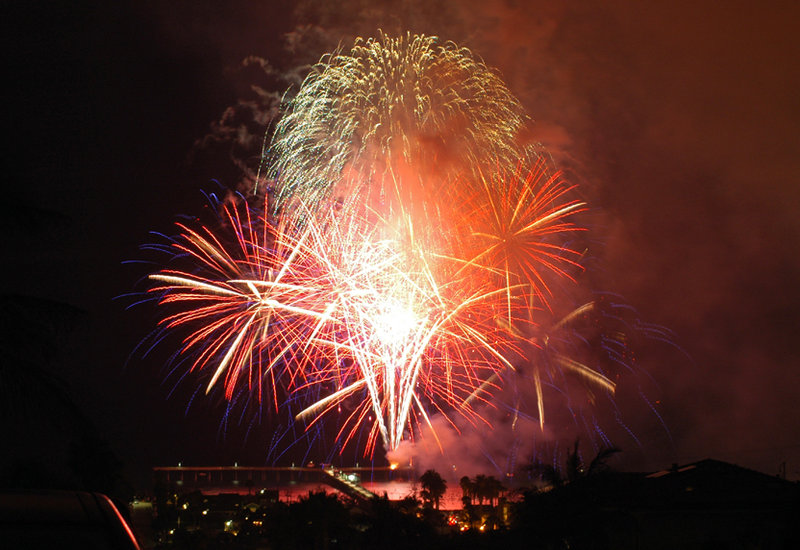 The big finale of the Ocean Beach fireworks show off the OB Pier last night. Photo shot from the intersection of Guizot and Narragansett. / Photo by Thomas Melville