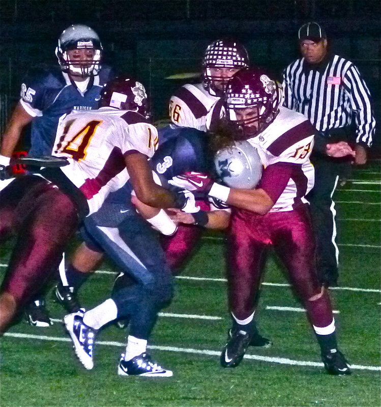 In a rain-soaked Western League showdown Nov. 4, Point Loma High School’s (PLHS) Pointers succeeded in spoiling powerful Madison High’s effort to record an undefeated season. But the Pointers didn’t win, either. The two teams battled to a 13-13 tie before a small crowd at the new Warhawks stadium complex after the Dogs’ tenacious defense and strong running attack staked the visitors to a 10-0 third-quarter lead. But it didn’t last. In fact, only a pressure-packed 29-yard field goal in strong windy conditions by senior kicker Felipe Soares with 17 seconds left in the game prevented the Pointers from losing a game they had led almost all night. The tie left the Pointers at 6-2-1 overall (3-0-1 in Western League) while Madison, who entered the game averaging 40 points per game, dropped to 8-0-1 (3-0-1). The long-awaited game took an unexpected turn when Warhawks all-star quarterback Chase Knox left the game in the first quarter after suffering a dislocated finger. With backup Bo Kaimuloa under center, Madison went to an unproductive up-the-middle running game that the Pointers repeatedly shut down. Pointers running backs, meanwhile, had picked up significant yardage against the stunned Warhawks, and a Jaivon Griffin 16-yard touchdown run sent the teams to intermission with a 7-0 lead in favor of Point Loma. Knox reappeared to open the second half for Madison, but was ineffective until Soares’ first field goal of the night gave the Dogs a 10-0 lead with 5:34 left in the third period. The Pointers again threatened to score, but a 38-yard field goal attempt by Ruben Diaz failed, giving Madison the ball on their own 20. From here, Madison star running back Pierre Cormier, who had been bottled up all night, broke free for an 80-yard touchdown run, closing the Pointer lead to 10-7. Outside of this run, Cormier carried 15 times for only 14 yards. After a 26-yard pass completion from Sam Augustine to Matt Magers, the Pointers threatened again after rains resumed in the fourth quarter, but an interception killed that drive.  The Warhawks then made their move, driving to the Pointer 8-yard line where, on a fourth-down play, Knox hit Kaimuloa with a scoring pass. Jon Denae Bailey’s block of the Madison extra point attempt and a desperate Pointer drive set up Soares’ crucial tying field goal. The Pointers totaled 322 yards in offense, 269 of it on the ground. Griffin (23 carries for 112 yards) led the attack while Morris Mathews’ nine carries for 87 yards included a 49-yard burst. Eric Bueno picked up 46 yards and Branden Martin had 29. In a strange series of events, an overtime session was agreed upon some 15 minutes after the end of regulation time. The teams had met for handshakes, while game officials left the field and many fans had left the stadium.  During the extra period, the Pointers were driving before Diaz’s 33-yard field goal attempt was partially blocked. The Warhawks’ possession resulted in a 41-yard field goal situation, but when a Pointer jumped offside, the resulting 36-yard attempt was successful. Bits ’n’ bites • Many in the audience and news media questioned the need to play the overtime session. The Pointers (CIF Div. III) and Warhawks (CIF Div. IV) are not pitted against each other in playoff seeding meetings. Madison, however, was declared the official Western League champion based on the overtime results. • Diaz was given the opportunity to attempt a 52-yard field goal in the first quarter. His booming kick bounced off the goalpost crossbar, falling perhaps a foot short. • The Pointers dominated the undefeated Warhawks throughout much of the game. • The Madison junior varsity prevailed 21-6 in a drenching rain before the varsity match, leaving the Pointers with a 5-4 record. •?The Pointer freshmen topped Madison by the same score, improving to 6-2.