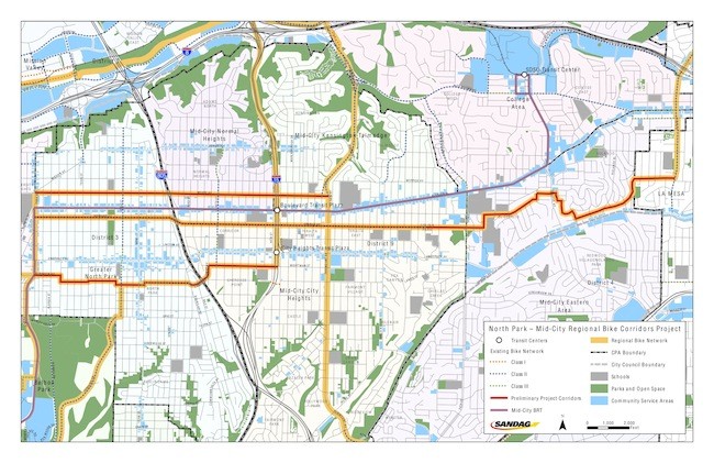 This map of North Park, Normal Heights, Kensington, Talmadge and City Heights was used at the meeting to solicit feedback. A second map showing routs from Mission Valley through Hillcrest and Bankers Hill was also used. (Courtesy SANDAG)
