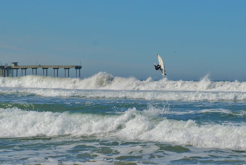 A new surfing prototype has hit South Mission Beach and other local sand sanctuaries, delighting lifeguards and beachgoers alike with her performance of agile tricks on even the smallest of waves. Melika is not the typical surfer girl. At less than two feet tall, this next-generation surfer can ride the tiniest of waves and still launch five to seven feet in the air, showing off aerial surf tricks with ease. No matter how hard she falls, she always gets right back up again. Melika is an RC Surfer — a remote-controlled surfer, that is — with a range of 300 yards, equipped with a propeller that turns at 20,000 rpm. She is mounted on a weighted board to ensure the surfer self-rights after each crash. Australian Jason Hall invented the original radio-controlled surfing model 30 years ago after the swells on the southeastern coast of Australia went flat for a time and the natives began to get restless. In 1995, Hall’s design was refined, and he launched his own radio-controlled surfer company called RC Surfer. Longtime Midway-area resident Tom Dart first got involved in the hobby when Kyosho, a Japanese RC company, launched its own model in 2000. By 2005, however, the company no longer produced the model, which left Dart with three broken surfers and no new parts to be had. With a DVD from Maui RC Surfers, the modern-day innovators of the brand, Dart began building his own model — Melika — named after an old girlfriend. He started his project with a $20 surfboard he found on Craigslist, stripped the glass to get to the foam and got to work on his new creation. “I had never shaped surfboards before,” Dart said. “I had to learn so much. I got a how-to DVD called ‘Shaping 101’ and ‘Glassing 101,’ used YouTube a lot, and thank goodness for surfersteve.com,” he said. “I also made scaled-down versions of common tools used in shaping. All this on top of the hardware installations.” Although Dart launched into a hobby that was entirely new to him, he found peace in shaping surfboard foam and a sense of accomplishment in making a “hot-rod little surfboard” out of someone else’s scraps. Throughout the project, Dart pieced together hardware from all realms of the RC world — from monster trucks to jet boats — until Melika was finally perfected. “She is also made of surfboard foam, the scraps leftover from the board glued together, glassed and painted,” he said. “I think she was 16 little pieces glued together.” Dart said the six hours of sculpting Melika was “the ultimate rush,” which took time, numerous scraps of foam, glue, sandpaper and a photo of professional surfer Carissa Moore. “I guess there’s a sculptor inside me,” he said. The entire project took Dart four months of hard work to complete, including time spent learning how to shape foam and glass on boards, how to make the wood fins, and vetting various prototypes to come up with the perfect model for his purposes. Whether high tide or low tide, Dart and Melika can be seen regularly on weekdays at her favorite surf spots near Dog Beach and at South Mission Beach at the jetty. Dart doesn’t intend to stop there. “It’s way too cool not to continue,” he said. “Melika will not be alone. Nikki is on the way and Olivia will not be far behind — the RC Surf Divas.”