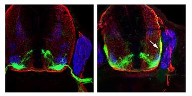 The researchers set up a series of experiments to examine how p190 affects axons leaving the spinal cord. They found that, although axons are normally attracted to a protein in the spinal cord called netrin, during a short time window p190 acts as a blinder, so the axons disregard netrin and are led outside of the spinal cord. After the axons safely leave the central nervous system, this blinder is removed. Without p190, the axons are attracted to netrin and do not properly leave the spinal cord, so never connect with muscles.