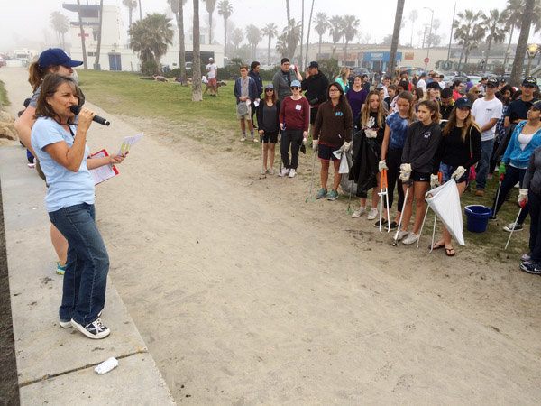 Councilmember Lorie Zapf (left) fires up the more than 300 volunteers, who along with I Love a Clean San Diego, came out for the Ocean Beach Spring Clean event on Saturday, March 11. Volunteers painted more than 25 bike racks along newly repaved Newport Avenue and removed more than 500 pounds of trash from the beach and alleyways during the morning cleanup. / PHOTO BY THOMAS MELVILLE