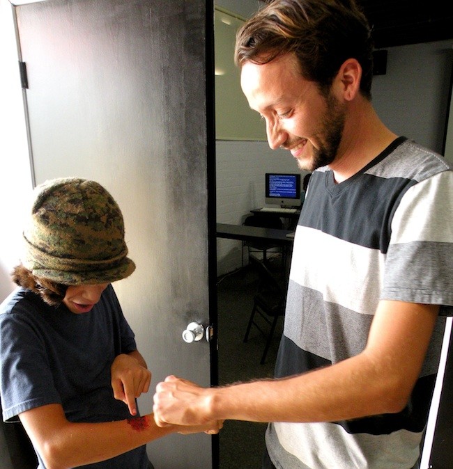 (l to r) Anthony shows his artificial wound, made with glue and markers, to instructor Evan Apodaca (Photo by Cynthia Robertson)