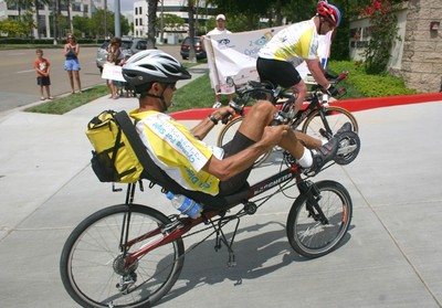 Rider Danny Baker from Utah, who has retinitis pigmentosa, heads into the institute, 4555 Executive Dr., on his recumbent bike. Youngsters cheered on cyclists approaching the Braille Institute Aug. 6 during the second annual Cycling for Sight ride. The 30-plus cyclists left Santa Barbara on Aug. 4, riding south through Mailbu and Laguna Beach on their 200-mile trek. They were joined by 15 local blind and visually impaired children on tandem bikes at the Torrey Pines Glider Port. The riders raised more than $30,000, which will benefit the Braille Institute of America and the Foundation Fighting Blindness.